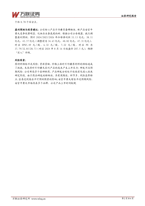 盈利预测与投资建议:公司核心产品片仔癀具备稀缺性,新产品安宫牛黄丸竞争优势明显,化妆品业务表现向好。根据公司公告披露,我们调整盈利预测,预计2024/2025/2026年归母净利润33.13亿元、38.11亿元、43.57亿元(调整前为34.65亿元、40.82亿元、47.31亿元),对应EPS5.49元/股、6.32元/股、7.22元/股,对应PE为37.79/32.85/28.73(对应2024年8月16日收盘价207.5元),维持“买入”评级。