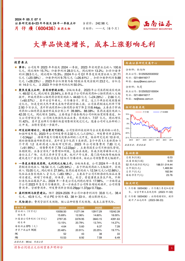 风险提示:费用管控不及预期、核心品种销售不及预期、成本上涨等风险。