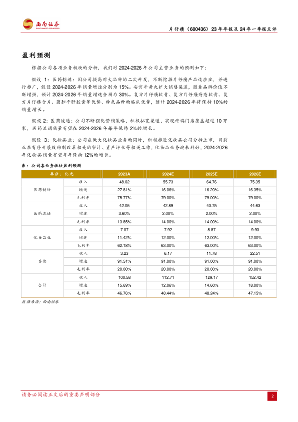 聚焦发展大品种,夯实经营提业绩。分板块来看,2023年公司医药制造实现收入48.02亿元,同比增长25.94%,主要得益于公司肝病用药和心脑用药收入大幅提升,肝病用药和心脑用药分别实现收入44.63亿元(+24.26%)、2.66亿元(+60.57%),其中安宫牛黄丸、片仔癀含片、肝宝,这三个单品实现销售额过亿元,但是受到天然牛黄及其他中药材价格上涨,公司医药制造毛利率下降2.93个百分点,其中肝病用药和心脑用药分别下降2.11/8.44pp,主要在于肝病用药和心脑用药直接材料成本分别上升39.86%、88.08%;医药流通实现收入42.05亿元,同比增长3.6%,主要得益于报告期内公司积极拓宽销售渠道,加大公司营销宣传;公司做大做强化妆品业务,实现收入7.07亿元,同比增长11.42%,其中皇后牌片仔癀珍珠霜销售额实现过亿元。随着公司对大品种的二次开发,业绩有望进一步提升。