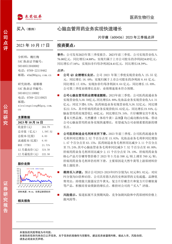 片仔癀在2023年前三季度实现了稳健的营收和净利润增长,其中医药制造业务,特别是心脑血管用药业务,表现出强劲的增长势头,有望成为公司未来业绩的重要驱动力。然而,公司医药制造业的毛利率受到天然牛黄等上游原材料价格上涨的压力,尽管核心产品已提价,但成本挑战依然存在。分析师基于公司强大的品牌优势和积极的产品策略,维持“买入”评级,并预计公司未来将继续保持增长,但投资者需警惕潜在的市场和成本风险。
