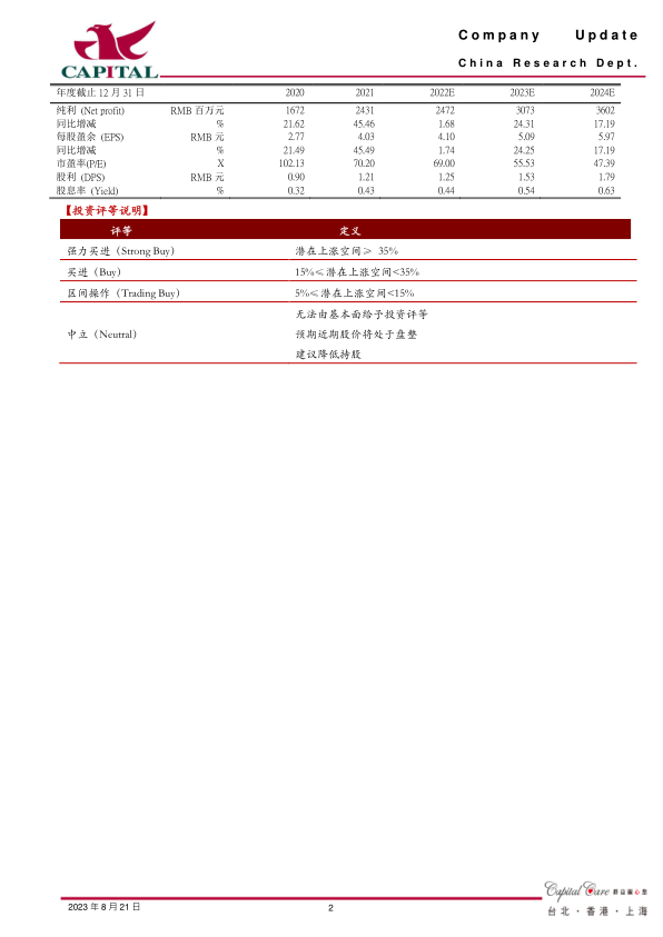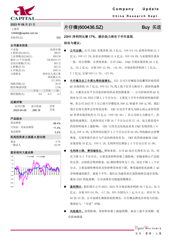 盈利预计:我们预计公司2022、2023年分别实现净利润30.7亿元、36.0亿元,分别YOY+24.3%、+17.2%,EPS分别为5.1元/6.0元,对应PE为56倍/47倍,公司业绩长期保持较快增长,片仔癀品牌也具有较大价值,继续给与“买进”评级。