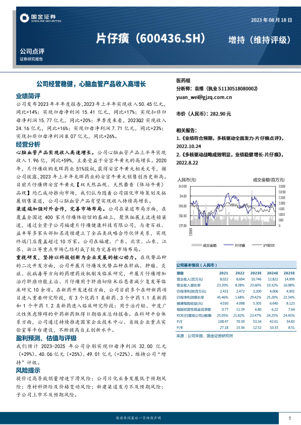 根据盈利预测,公司未来几年归母净利润将保持稳健增长,预计2023-2025年分别增长29%、25%和22%,维持“增持”评级。然而,公司也面临提价导致销量下滑、日化业务发展不及预期、原材料供给及价格波动、渠道发力不及预期以及子公司上市不及预期等潜在风险。总体而言,片仔癀凭借其核心产品的强劲表现、广泛的渠道布局和持续的研发投入,展现出良好的增长潜力和市场竞争力。