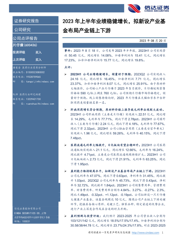 2023年上半年,片仔癀公司凭借核心产品片仔癀的提价策略和稳健的市场表现,实现了营收和净利润的双重增长。尽管原材料价格上涨对部分产品毛利率构成压力,但公司通过优化运营和扩大医药流通规模,保持了较高的整体盈利能力。展望未来,公司计划设立大健康产业基金,旨在通过战略投资进一步巩固和拓展产业链优势。综合来看,片仔癀展现出强大的市场竞争力、稳健的财务状况和清晰的战略发展路径,尽管存在销售不及预期和原材料价格波动的风险,但其稀缺的产品价值和持续的增长潜力使其获得“买入”的投资评级。