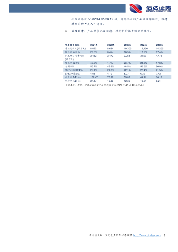 盈利预测与投资评级:我们预计2023-2025年公司营业收入分别为103/121/142亿元,同比增长18.5%/17.5%/17.4%,归母净利润分别为30.58/38/44.78亿元,同比增长23.7%/24.3%/17.8%,对应2023-2025年市盈率为55.82/44.91/38.12倍,考虑公司的产品力及稀缺性,维持对公司的“买入”评级。