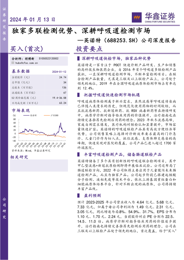英诺特作为一家深耕呼吸道快速诊断市场的POCT企业,凭借其独家的多联检测产品优势和领先的市场份额,在呼吸道病原体检测领域建立了核心竞争力。公司通过把握呼吸道疾病快速检测市场扩容的机遇,积极拓展医院渠道并布局家庭自测市场,同时在肠道检测等新领域储备发力点,展现出强劲的增长潜力。尽管面临市场推广、竞争加剧、需求波动和集采等风险,但公司多技术平台支撑下的产品线持续丰富和创新,预计将使其业绩保持稳健增长。基于对公司核心优势、市场机遇和未来发展潜力的分析,报告给予英诺特“买入”的投资评级。