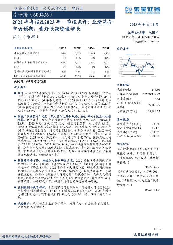 本报告对片仔癀(600436)2022年年报及2023年一季报进行了点评,核心观点如下: