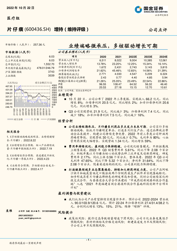 本报告对片仔癀2022年三季度业绩进行了分析,指出公司业绩短期承压,但通过多核驱动战略和持续的新药研发投入,未来发展可期。公司通过优化销售模式和渠道结构,盈利能力保持稳健。维持对公司“增持”评级,并提示了相关风险。