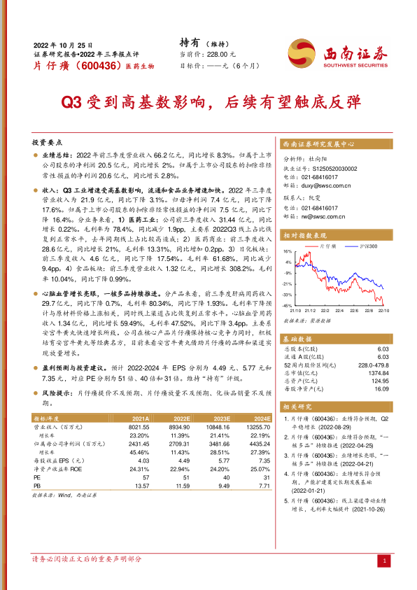 片仔癀2022年前三季度业绩整体保持增长,但第三季度受高基数影响,营收和净利润出现短期下滑。尽管如此,公司在医药商业和食品板块表现出强劲的增长势头,且“一核多品”战略成效显著,特别是安宫牛黄丸的快速放量为公司贡献了新的增长点。财务预测显示,公司未来营收和净利润将恢复两位数增长,盈利能力和财务结构持续优化。分析师维持“持有”评级,并提示了片仔癀提价、放量及化妆品销量不及预期等潜在风险,建议投资者密切关注。