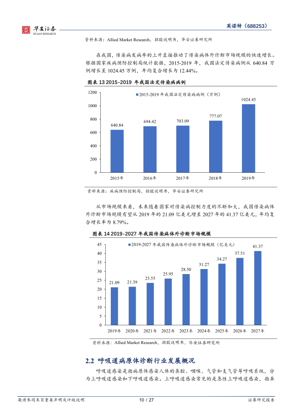 传染病诊断是体外诊断(IVD)中增速最快的细分子领域之一。根据Allied Market Research预测,2019-2027年全球传染病诊断市场规模将从235.51亿美元增至358.59亿美元,年均复合增长率为5.40%。我国传染病发病率上升推动了市场增长,2015-2019年我国法定传染病例从640.84万例增至1024.45万例,年均复合增长12.44%。预计我国传染病体外诊断市场规模将从2019年的21.09亿美元增至2027年的41.37亿美元,年均复合增长率为8.79%。
