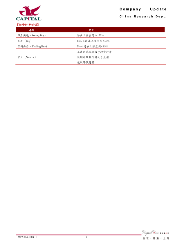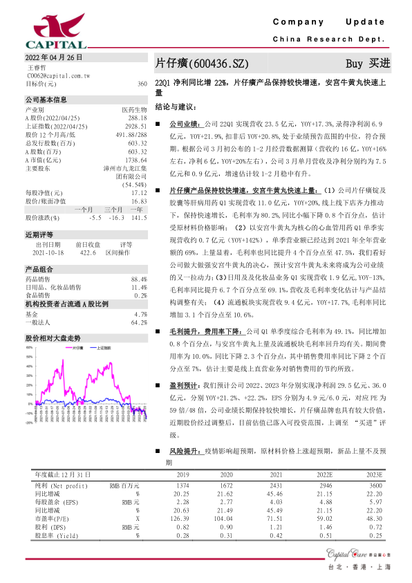 盈利预计: 我们预计公司 2022、 2023 年分别实现净利润 29.5 亿元、 36.0亿元,分别 YOY+21.2%、 +22.2%, EPS 分别为 4.9 元/6.0 元,对应 PE 为59 倍/48 倍, 公司业绩长期保持较快增长, 片仔癀品牌也具有较大价值,近期股价经过调整后,目前估值已落入可投资范围,上调至 “ 买进”评级。