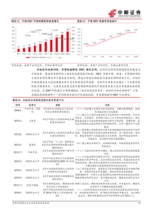 中国POCT市场正处于快速发展阶段,市场规模从2015年的43亿元快速增长至2021年的173亿元,年复合增长率高达43.19%,预计到2024年市场规模将达到近290亿元。POCT渗透率也从2016年的11.8%提升至2021年的13.9%。分级诊疗政策的持续推进,将康复治疗和慢病患者转诊至基层医疗机构,POCT凭借其方便、快速、不依赖大型设备的优势,成为基层医疗的重要方式。同时,国务院、国家卫健委等机构发布系列文件,大力支持POCT在临床端的应用,特别是呼吸道系统疾病的精准诊疗需求,为POCT快检产品在基层医院的快速放量提供了政策支持。