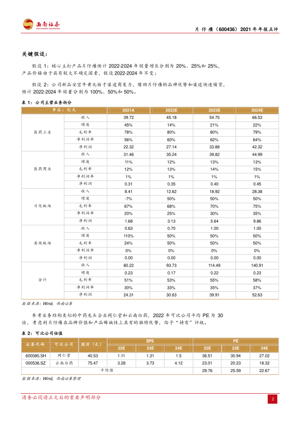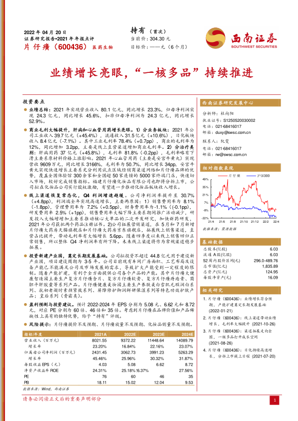 本报告全面分析了片仔癀2021年年报,指出公司业绩增长亮眼,盈利能力提升,"一核多品"战略持续推进,线上渠道拓展和产业园建设为长期发展奠定基础。维持“持有”评级,但同时也提示了相关风险,为投资者提供了有价值的参考信息。