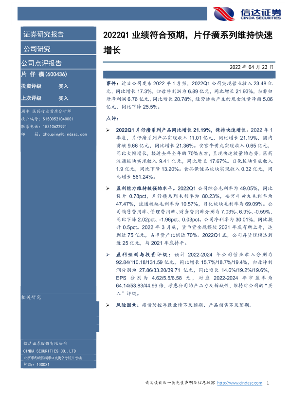 本报告分析了片仔癀(600436)2022年一季度业绩,指出: