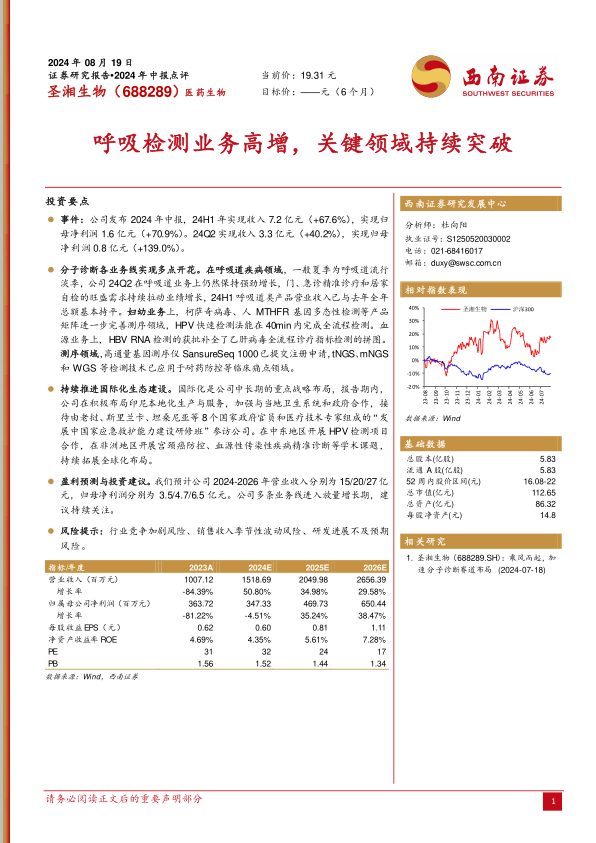 圣湘生物2024年上半年业绩表现亮眼,营业收入和归母净利润均实现大幅增长,主要得益于呼吸检测业务的强劲拉动以及分子诊断各细分领域的持续突破。公司在妇幼、血源和测序等业务线均有新进展,并积极推进国际化战略,构建全球化生态。尽管面临行业竞争、销售季节性波动和研发进展不确定性等风险,但随着多条业务线进入放量增长期,公司未来发展潜力值得持续关注。