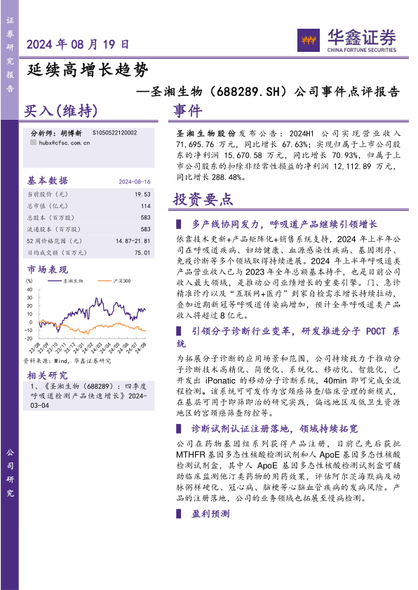 本报告分析了圣湘生物(688289.SH)2024年上半年的业绩,并维持“买入”评级。