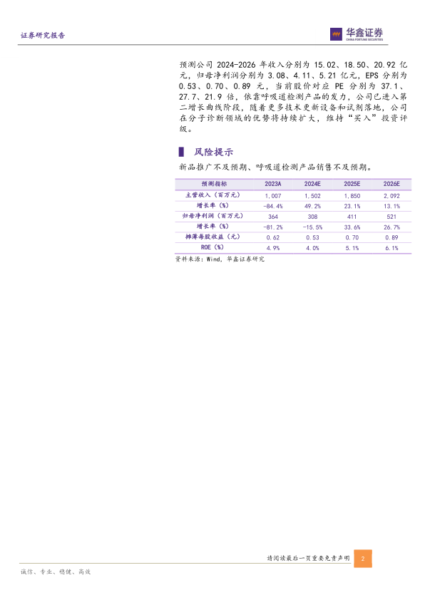 预测公司2024-2026年收入分别为15.02、18.50、20.92亿元,归母净利润分别为3.08、4.11、5.21亿元,EPS分别为0.53、0.70、0.89元,当前股价对应PE分别为37.1、27.7、21.9倍,依靠呼吸道检测产品的发力,公司已进入第二增长曲线阶段,随着更多技术更新设备和试剂落地,公司在分子诊断领域的优势将持续扩大,维持“买入”投资评级。