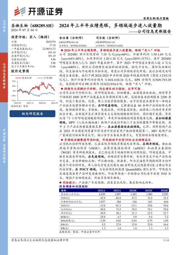 圣湘生物凭借在分子诊断领域的深耕和多领域赛道的积极布局,2024年上半年业绩表现出色,展现出强劲的增长潜力。公司通过内生增长和外延扩张双轮驱动,不断提升其在IVD行业的竞争力。虽然下调了短期盈利预测,但维持“买入”评级,看好公司未来的发展前景。投资者应关注产品推广、政策变化和集采等风险因素。