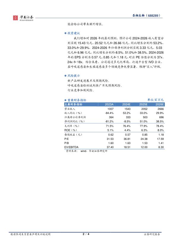 我们增加对2026年的盈利预测,预计公司2024-2026收入有望分别实现15.43亿元、20.52亿元和26.66亿元,同比增长分别约53.2%、33.0%和29.9%,2024-2026年归母净利润分别实现3.33亿元、5.03亿元和6.96亿元,同比增长分别约-8.5%、51.0%和38.5%。2024-2026年的EPS分别为0.57元、0.85元和1.18元,对应PE估值分别为37x、24x和18x。综合来看,公司通过多元化布局,打造平台型IVD企业,在呼吸道感染和生殖道感染多个领域竞争优势显著,维持“买入”评级。