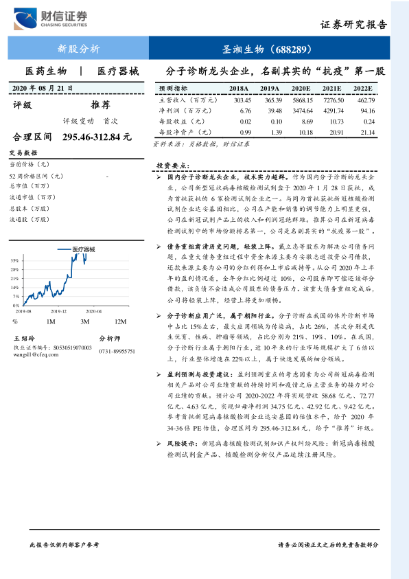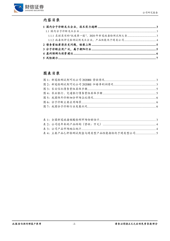 本报告核心观点指出,圣湘生物作为国内分子诊断领域的龙头企业,凭借其卓越的技术实力和快速响应能力,在2020年新冠疫情期间表现出强劲的业绩增长,成为名副其实的“抗疫第一股”。同时,公司通过债务重组解决了历史遗留问题,轻装上阵,并受益于分子诊断这一朝阳行业的广阔前景。