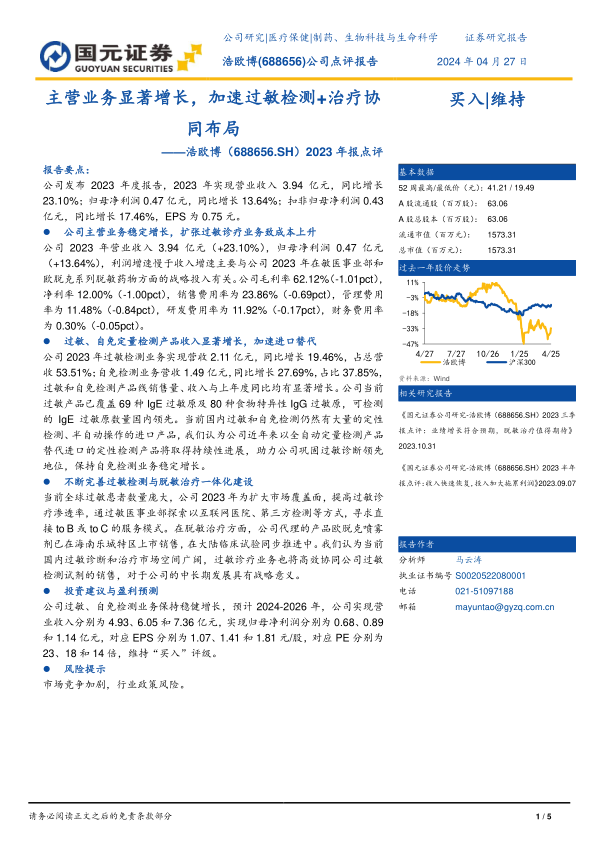 公司过敏、自免检测业务保持稳健增长,预计2024-2026年,公司实现营业收入分别为4.93、6.05和7.36亿元,实现归母净利润分别为0.68、0.89和1.14亿元,对应EPS分别为1.07、1.41和1.81元/股,对应PE分别为23、18和14倍,维持“买入”评级。
