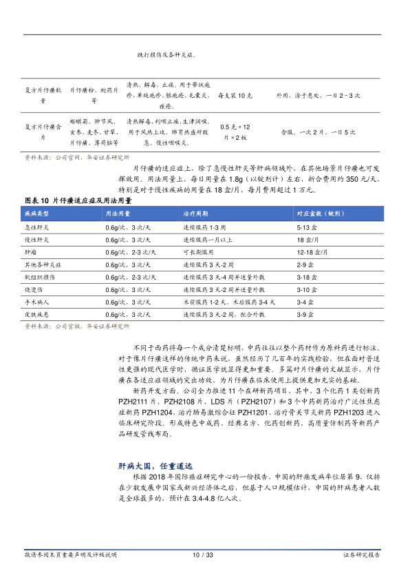 片仔癀以其卓绝的医疗功效著称,功能主治为清热解毒、凉血化瘀、消肿止痛,用于热毒血瘀所致急慢性病毒性肝炎、痈疽疔疮、无名肿毒、跌打损伤及各种炎症,属于处方药范畴。根据使用场景和用量的不同,公司推出了片仔癀锭剂(3g)、片仔癀胶囊(0.3g×6粒)以及复方片仔癀等系列产品。在适应症方面,除了肝病领域,片仔癀在其他炎症、软组织损伤、烧烫伤、手术病人及皮肤疾患等场景也发挥效用。每日用量约1.8g(以锭剂计),折合费用约350元/天,慢性疾病每月费用可超1万元。公司积极推进11个在研新药项目,其中3个化药1类创新药和3个中药新药已进入临床研究阶段,形成了特色中成药、经典名方、化药创新药、高质量仿制药等新药产品研发管线布局。