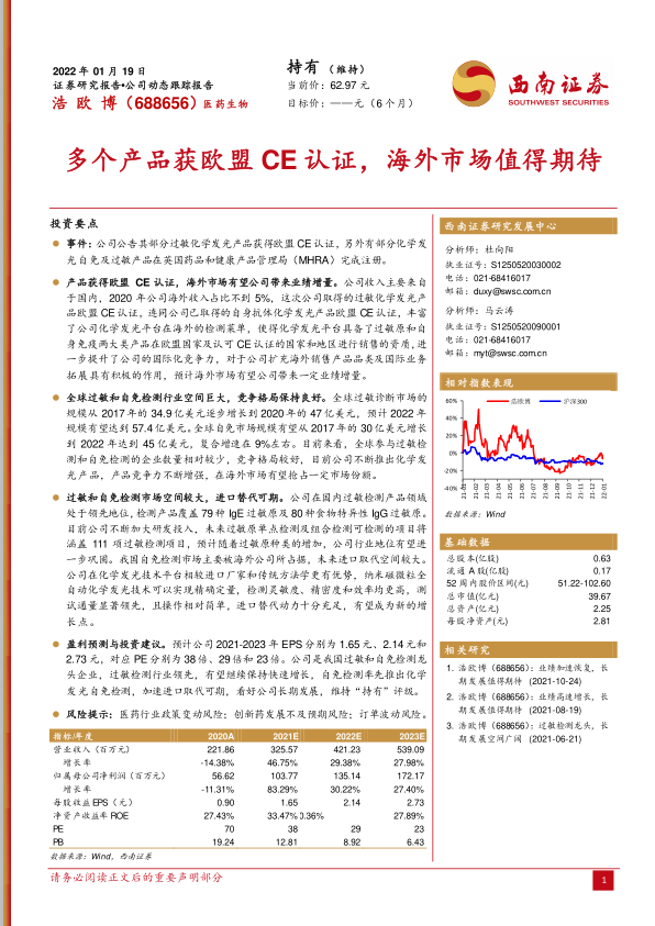 预计公司2021-2023年EPS分别为1.65元、2.14元和2.73元,对应PE分别为38倍、29倍和23倍。公司是我国过敏和自免检测龙头企业,过敏检测行业领先,有望继续保持快速增长,自免检测率先推出化学发光自免检测,加速进口取代可期,看好公司长期发展,维持“持有”评级。