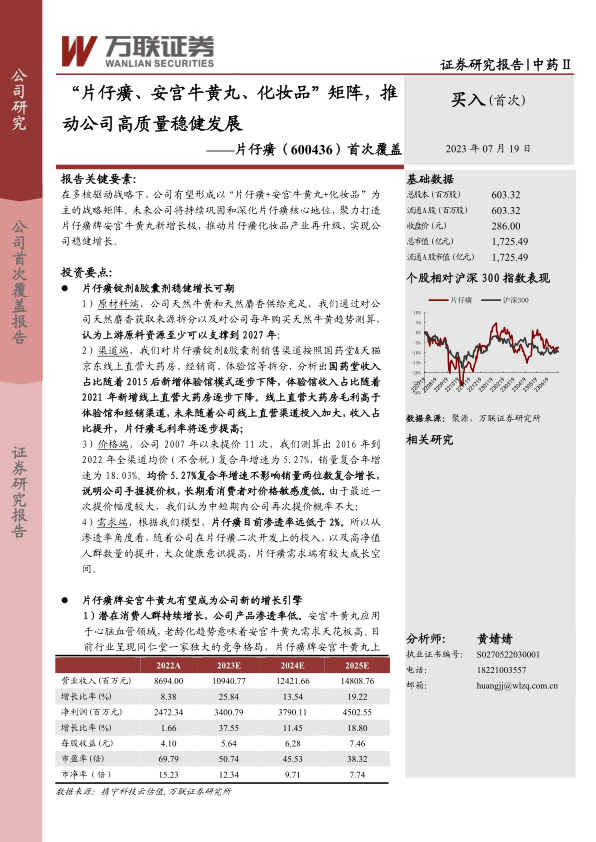 片仔癀牌安宫牛黄丸凭借公司在天然原材料获取、品牌影响力、多元渠道布局及新老产品联动销售方面的显著优势,有望成为公司业绩的第二增长曲线,在心脑血管用药市场中持续扩大市场份额。同时,化妆品业务在完成架构整合与价格体系梳理后,预计将实现业绩扭负为正,贡献新的增长点。公司整体盈利能力强劲,预计2023-2025年收入和归母净利润将持续增长,展现出良好的投资价值,首次覆盖给予“买入”评级。
