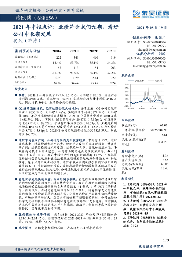 盈利预测与投资评级: 我们维持 2021-2023 年归母净利润预测为1.13/1.54/2.03 亿元。当前市值对应 2021-2023 年 PE 分别为 35 倍、 25倍、 19 倍,维持“买入”评级。