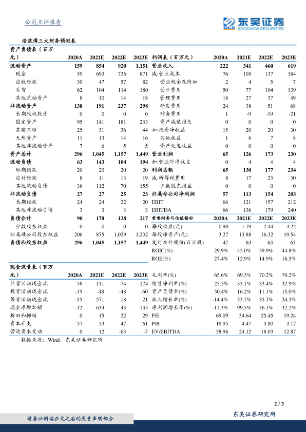 Q2 继续高速增长, 经营性现金流大幅增加: 分季度看, Q2 公司实现营业收入 8655 万元,同比增长 48%;实现归母净利润 3174 万元,同比增长 30%,单季度业绩继续高速增长。 2021H1 公司销售费用为 3020 万元(+38.7%,同比,下同),销售费用率为 20.47%(-7.17pp);管理费用为 1335 万元(+98.7%),管理费用率为 9.05%(+0.53pp),主要是薪酬增加及 IPO 相关费用所致;研发费用为 1284 万元(+12.2%),研发费用率为 8.7%(-5.81pp)。 2021H1 公司实现经营性现金流 3325 万元,同比增长 163.7%。