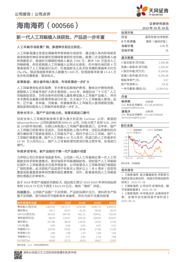 本报告对海南海药的新一代人工耳蜗产品获批进行了分析,认为人工耳蜗市场前景广阔,政策支持力度加大,国产产品凭借价格优势有望实现进口替代。虽然公司短期盈利预期有所下调,但长期来看,仍具有增长潜力,维持“增持”评级。