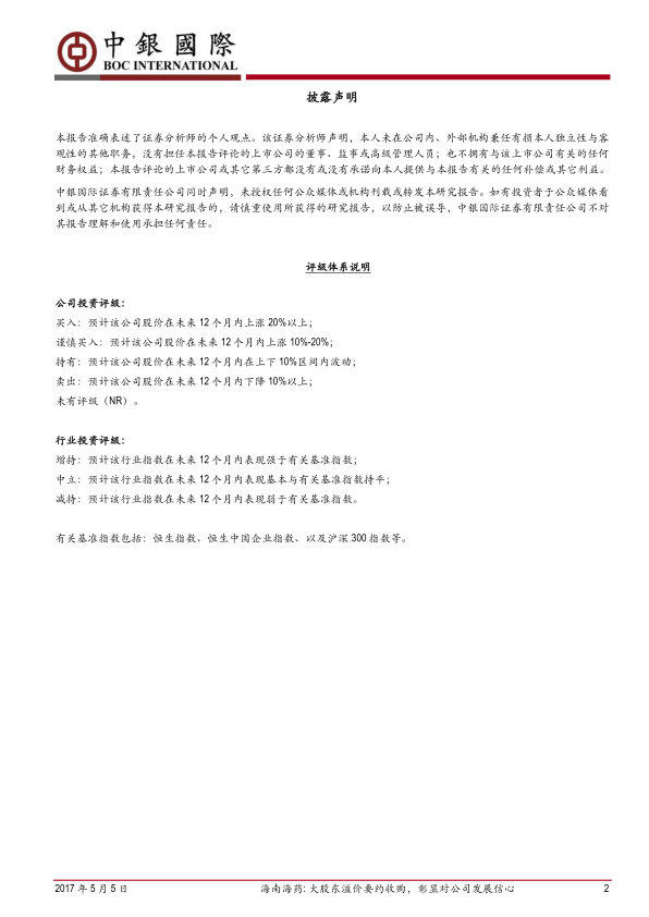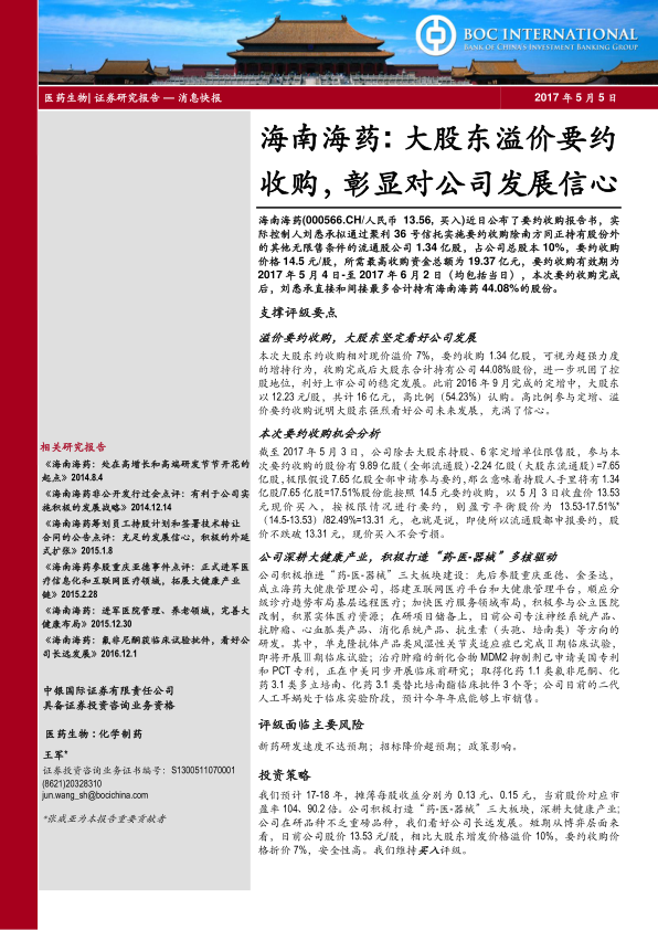 报告指出,公司评级面临的主要风险包括新药研发速度不达预期、招标降价超预期以及政策影响。 尽管存在风险,但基于公司积极打造“药-医-器械”三大板块、深耕大健康产业的战略,以及在研品种中不乏重磅品种的潜力,报告看好公司长远发展。从短期博弈层面来看,当前股价13.53元/股,相比大股东增发价格溢价10%,但相比要约收购价格折价7%,具备较高的安全性。综合以上分析,报告维持对海南海药的“买入”评级,并预计2017-2018年摊薄每股收益分别为0.13元和0.15元,当前股价对应市盈率分别为104倍和90.2倍。