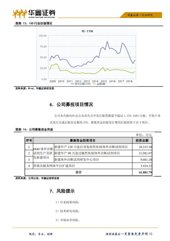 国内过敏原检测市场的主要竞争对手包括赛默飞、德国欧蒙等,自身抗体检测市场的主要竞争对手包括德国欧蒙、深圳亚辉龙等。选取IVD行业的迈克生物、安图生物等作为可比公司。目前IVD行业整体估值水平在44倍左右,可比公司的平均估值水平在30倍左右。