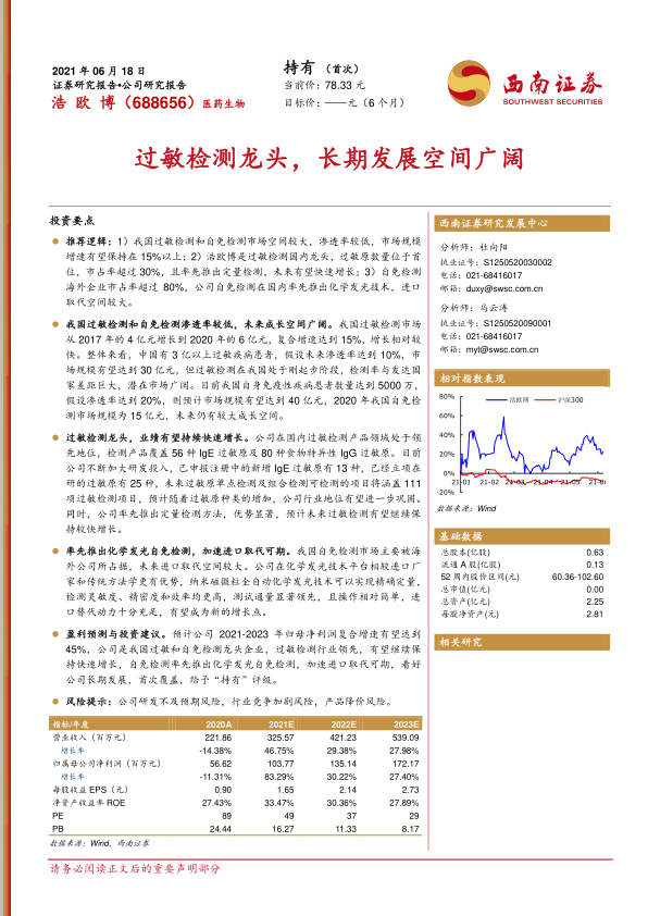 根据关键假设,预计浩欧博2021-2023年营业收入分别为3.3亿元、4.2亿元和5.4亿元,归母净利润分别为1亿元、1.4亿元和1.7亿元,对应EPS分别为1.65元、2.14元和2.73元,PE分别为49倍、37倍和29倍。 与可比公司(迈瑞医疗、安图生物、新产业、亚辉龙)相比,2021年平均PE为51倍。鉴于浩欧博在国内过敏和自免检测领域的龙头地位、快速增长潜力以及进口替代前景,首次覆盖给予“持有”评级。 风险提示包括公司研发不及预期、行业竞争加剧和产品降价风险。