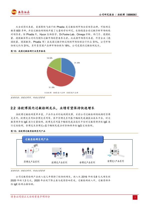全球过敏检测市场由美国赛默飞旗下的Phadia主导。在中国市场,外资企业(如德国欧蒙、德国敏筛、Phadia)合计市场份额约占51%,浩欧博市场份额约31%,是国内过敏检测龙头。 浩欧博拥有符博克、欧博克和食博克等系列产品,覆盖56种IgE过敏原和80种食物特异性IgG过敏原,检测种类数量在国内处于领先地位。公司已申报注册中的新增IgE过敏原有13种,立项在研25种,未来可检测项目将涵盖111项,有望进一步巩固行业地位。公司率先推出的酶联免疫捕获法定量检测产品,于2016年上市,成为进口定量产品的主要竞品,预计未来有较大成长空间。