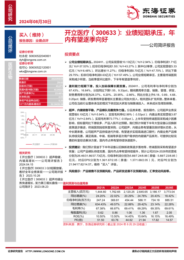 开立医疗2024年上半年业绩受到终端医院采购减少的影响,短期承压。但公司持续加大研发和销售投入,产品梯队不断完善,叠加下半年设备以旧换新政策的推动,预计公司业绩有望逐季向好,长期发展潜力巨大。