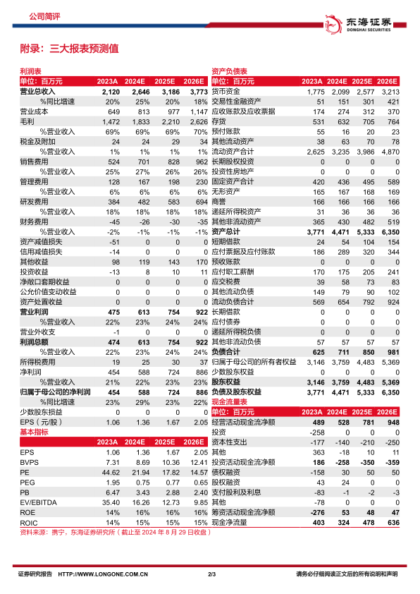盈利能力短期下滑,投入加码保障长期发展。2024H1,公司毛利率与净利率分别为67.43%、16.84%,分别同比下降1.55、9.33pct。期间费用率方面,销售、管理、研发、财务费用率分别为28.37%、6.20%、20.95%、-2.86%,同比分别上升6.18、0.89、4.68、0.20pct;销售、研发费用率显著增长主要是公司加大投入,相关团队扩充所致。整体来看公司在当前行业整体承压的情况下依旧加大研发与销售端投入,未来成长性得到保障。