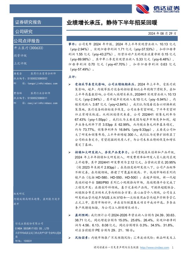 本报告分析了公司2024年中报,指出公司业绩受招采节奏变化影响短期承压,但持续加大研发投入,夯实产品竞争力。预计下半年随着招采回暖,公司业绩有望回归正常增长轨道。同时,报告也提示了内镜市场推广、汇率波动和新品研发等风险因素。