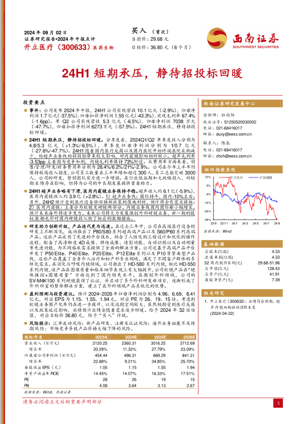 开立医疗2024年上半年业绩受国内医疗反腐及医院采购放缓影响,短期内面临营收和利润下滑的压力。然而,公司在此期间展现出战略韧性,通过加大研发和营销投入,持续推动超声和内窥镜两大核心业务的产品创新与升级,特别是在高端超声、消化呼吸内镜及微创外科硬镜领域取得了显著进展。尽管短期业绩波动,但分析师认为,随着医疗设备“以旧换新”政策的落地和市场需求的逐步回暖,公司凭借其在国产高端医疗设备领域的领先地位和不断丰富的产品线,具备较强的中长期增长潜力。基于对未来业绩的积极预测和可比公司估值,报告维持开立医疗“买入”评级,并设定目标价36.80元,建议投资者关注其长期发展价值。