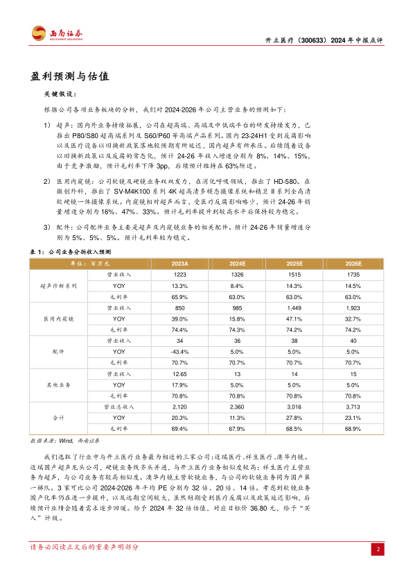 盈利预测与投资建议。预计2024~2026年归母净利润分别为4.96、6.69、8.41亿元,对应EPS为1.15、1.55、1.94元,对应PE为26、19、15倍。考虑到软镜业务国产化率仍在进一步提升,以及远期空间较大,虽然短期受到医疗反腐以及政策延迟影响,后续预计业绩会随着需求逐步回暖。给予2024年32倍估值,对应目标价36.80元,给予“买入”评级。