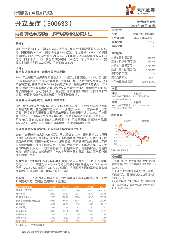 开立医疗在2023年表现出色,内窥镜业务的高速增长和高端化战略的成功是其主要驱动力。海外市场的拓展和技术创新也为公司未来的发展奠定了坚实的基础。尽管面临一些风险,但公司整体发展前景依然乐观,维持“买入”评级。