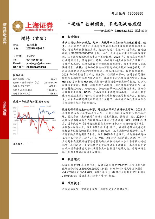 开立医疗(300633.SZ)作为国内领先的医疗器械企业,凭借其在超声和内镜领域的深厚技术积累和市场领导地位,持续推动“硬核”创新,并成功构建了涵盖微创外科和血管内超声(IVUS)在内的多元化产品战略。公司致力于研发具备独立自主知识产权、技术水平全球领先的高端医疗器械,产品线已实现从内科到“内科+外科”、从诊断到“诊断+治疗”、从设备到“设备+耗材”的全面扩张,初步形成多产品线发展格局。公司在全球范围内,尤其是在超声和消化内镜领域,已具备较强的品牌影响力及核心竞争力,并积极拓展国际市场,海外业务收入持续增长,占总收入比重接近一半。