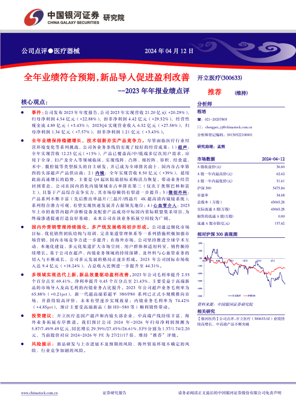 开立医疗2023年全年业绩表现稳健,营收和归母净利润均实现双位数增长,符合市场预期。公司通过持续的技术创新和高端新品的成功导入,显著提升了产品竞争力,尤其在超声和内镜两大核心业务领域表现突出,并带动了整体毛利率和净利率的改善。同时,公司积极强化国内外营销管理,国际市场收入占比提升,初步形成了多元化发展格局。展望未来,随着中高端产线的不断丰富和海外业务的有序拓展,公司有望保持持续增长,但仍需关注新品研发、海外贸易环境及行业竞争等潜在风险。