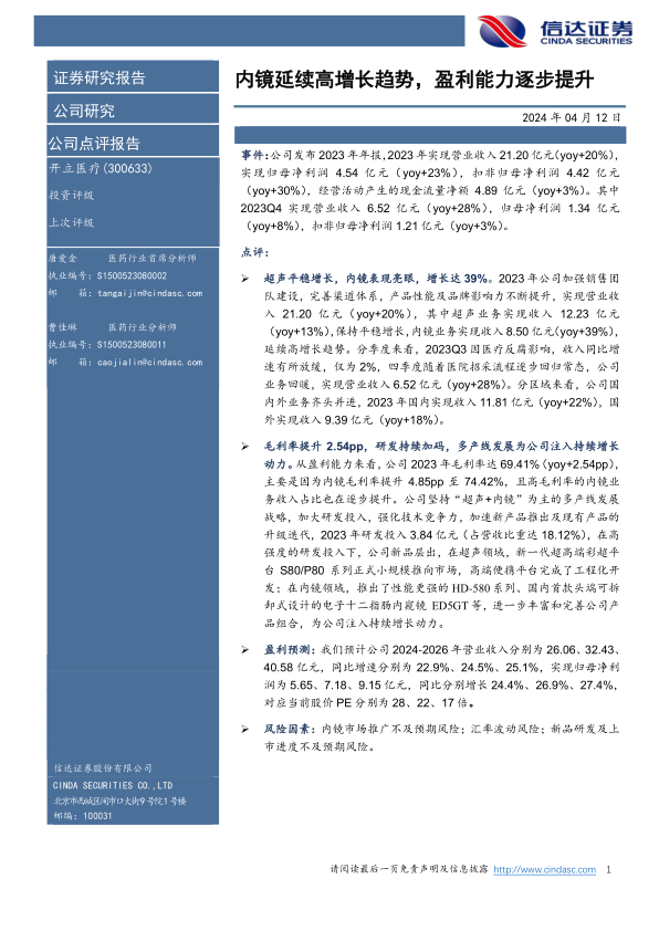 本报告分析了开立医疗2023年年报,指出公司在超声业务保持平稳增长的同时,内镜业务表现亮眼,成为主要增长动力。公司通过加强销售团队建设、完善渠道体系、提升产品性能及品牌影响力,实现了营业收入和净利润的稳健增长。