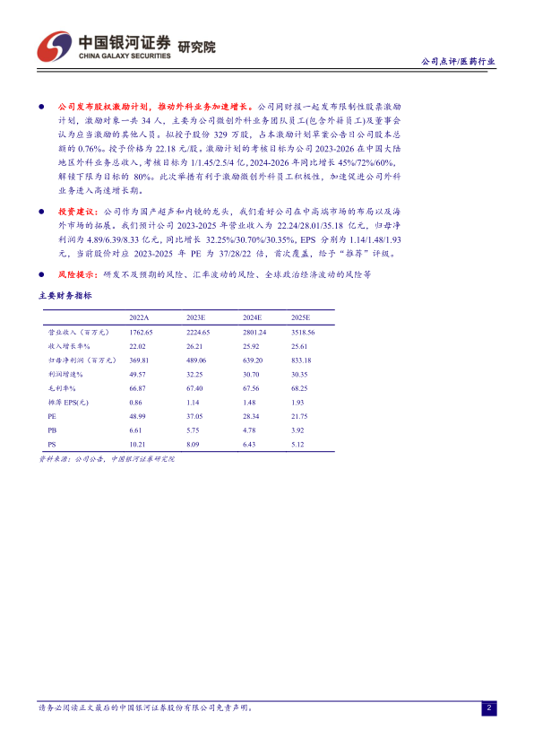 公司发布股权激励计划,推动外科业务加速增长。公司同财报一起发布限制性股票激励计划,激励对象一共34人,主要为公司微创外科业务团队员工(包含外籍员工)及董事会认为应当激励的其他人员。拟授予股份329万股,占本激励计划草案公告日公司股本总额的0.76%。授予价格为22.18元/股。激励计划的考核目标为公司2023-2026在中国大陆地区外科业务总收入,考核目标为1/1.45/2.5/4亿,2024-2026年同比增长45%/72%/60%,解锁下限为目标的80%。此次举措有利于激励微创外科员工积极性,加速促进公司外科业务进入高速增长期。