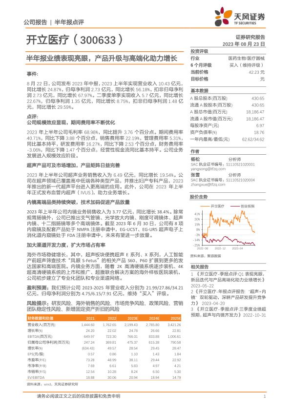 开立医疗2023年上半年业绩表现出色,得益于产品升级、高端化战略以及市场拓展的有效实施。公司在超声和内镜业务领域均实现了显著增长,并通过规模效应和费用优化提升了盈利能力。维持“买入”评级,但需关注研发、市场竞争、政策等多方面风险。