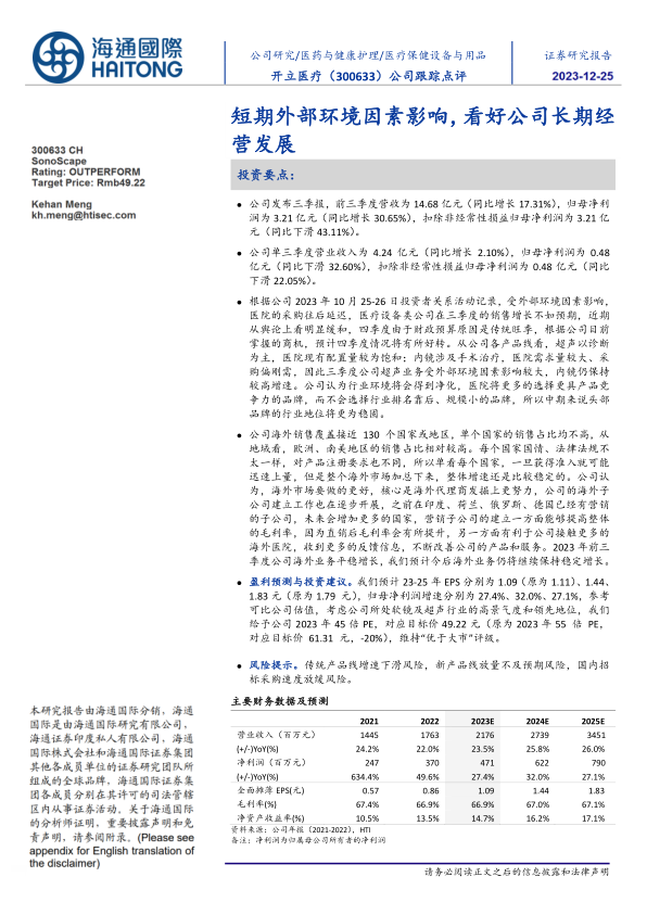 盈利预测与投资建议。我们预计23-25年EPS分别为1.09(原为1.11)、1.44、1.83元(原为1.79元),归母净利润增速分别为27.4%、32.0%、27.1%,参考可比公司估值,考虑公司所处软镜及超声行业的高景气度和领先地位,我们给予公司2023年45倍PE,对应目标价49.22元(原为2023年55倍PE,对应目标价61.31元,-20%),维持“优于大市”评级。