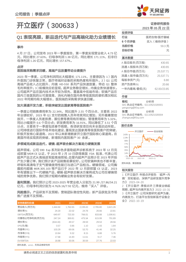 本报告对开立医疗2023年一季度业绩进行了全面分析,指出公司业绩增长主要受益于医院端采购需求回暖、高端产品放量和规模效应。公司在国际市场拓展和新品迭代方面取得显著进展,尤其是在超声和硬镜领域。报告维持“买入”评级,并对公司未来发展前景持乐观态度,但同时也提示了产品研发、营销团队和新产品推广等方面的风险。