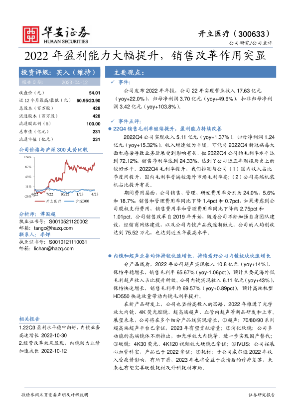 开立医疗2022年盈利能力大幅提升,销售改革效果显著,内镜业务快速增长,超声业务保持稳定。公司在新产品研发上持续投入,未来在超声、消化软镜、硬镜、IVUS和耗材等多个细分产品线均有增长潜力。维持公司“买入”评级,但需注意市场竞争、研发和采购需求等风险。
