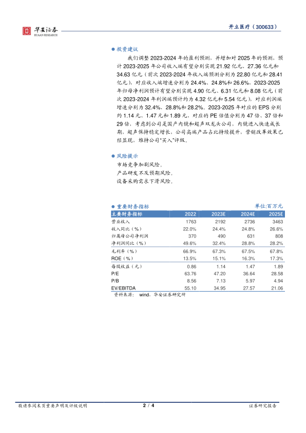 我们调整2023-2024年的盈利预测,并增加对2025年的预测,预计2023-2025年公司收入端有望分别实现21.92亿元、27.36亿元和34.63亿元(前次2023-2024年收入端预测分别为22.80亿元和28.41亿元),对应收入端增速分别为24.4%、24.8%和26.6%,2023-2025年归母净利润预计有望分别实现4.90亿元、6.31亿元和8.08亿元(前次2023-2024年利润端预计约为4.32亿元和5.54亿元),对应利润端增速分别为32.4%、28.8%和28.2%。2023-2025年对应的EPS分别约1.14元、1.47元和1.89元,对应的PE估值分别为47倍、37倍和29倍,考虑到公司是国产内镜和超声双龙头公司,内镜进入快速成长期,超声保持稳定增长,公司高端产品占比持续提升,营销改革效果已经显现,维持公司“买入”评级。