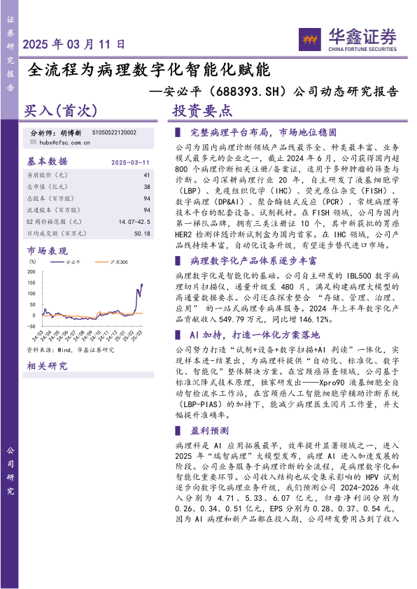 安必平(688393.SH)作为国内病理诊断领域的佼佼者,凭借其二十年深耕所构建的完整病理平台布局和多元化技术体系,在市场中占据稳固地位。公司拥有超过800个病理诊断相关注册/备案证,并在FISH和IHC等关键领域展现出领先优势和进口替代潜力。面对行业发展趋势,安必平正积极推进病理数字化和智能化转型,通过自主研发高通量数字病理切片扫描仪和探索一站式病理专病库服务,为AI赋能奠定基础。